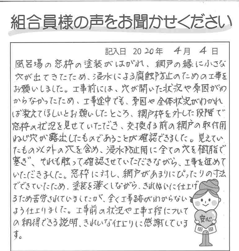 風呂場の窓枠の塗装がはがれ、網戸の縁に小さな穴が出てきたため、浸水による腐蝕防止のための工事をお願いしました。工事前には、穴が開いた状況や原因がわからなかったため、工事途中でも、原因や全体状況がわかれば教えてほしいとお願いしたところ、網戸枠を外した段階で窓枠の状況を見せていただき、交換する前の網戸の取付用ねじ穴が露出したものであることが確認できました。見えていたもの以外の穴を含め、浸水防止用に全ての穴を樹脂で塞ぎ、それも触って確認させていただきながら、工事を進めていただきました。窓枠に対し、網戸があまりにぴったりの寸法でできていたため、塗装を薄くしながら、きれいに仕上げるため苦労されていましたが、全く工事跡がわからないよう仕上がりました。工事前の状況や工事工程についての納得できる説明、きれいな仕上りに感謝しています。
