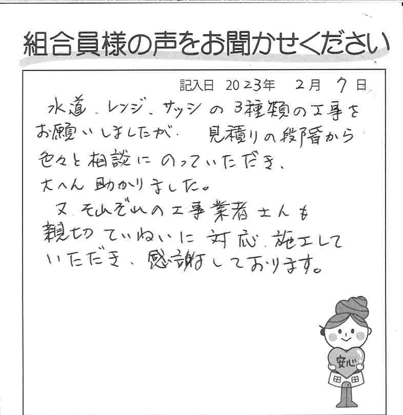 水道・レンジ・サッシの3種類の工事をお願いしましたが、見積りの段階から色々と相談にのっていただき、大変助かりました。又、それぞれの工事業者さんも親切ていねいに対応、施工していただき感謝しております。