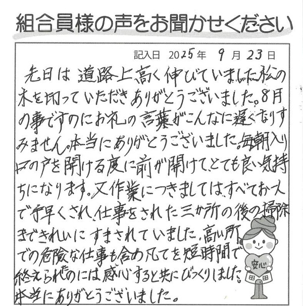 先日は道路上高く伸びていました松の木を切っていただきありがとうございました。8月の事ですのにお礼の言葉がこんなに遅くなりすみません。本当にありがとうございました。毎朝入り口の戸を開ける度に前が開けて、とても良い気持ちになります。又作業につきましては、すべてお一人で手早くされ、仕事をされた三か所の後の掃除まできれいにすまされていました。高い所での危険な仕事も含め凡てを短時間で終えられたのには感心すると共にびっくりしました。