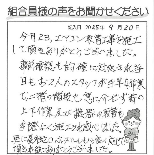 今月2日、エアコン取替工事を施工して頂きありがとうございました。