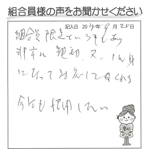 組合員限定という事もあり、非常に親切、又、親身になって対応してくれる。