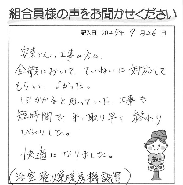 安東さん、工事の方々、全般においてていねいに対応してもらい、よかった。