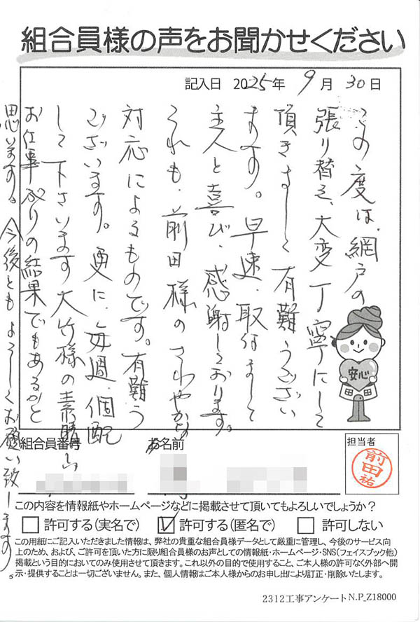 この度は網戸の張り替え、大変丁寧にして頂きまして有難うございます。早速取付けまして主人と喜び、感謝しております。それも前田様のさわやかな対応によるです。有難うございます。さらに、毎週個配して下さいます大竹様の素晴らしいお仕事ぶりの結果でもあるかと思います。今後ともよろしくお願い致します。
