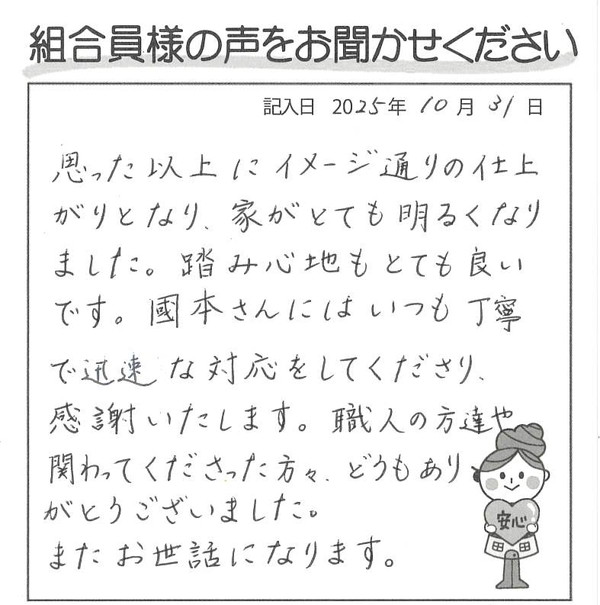 思った以上にイメージ通りの仕上がりとなり、家がとても明るくなりました。踏み心地もとても良いです。國本さんにはいつも丁寧で迅速な対応をしてくださり、感謝いたします。職人の方達や関わってくださった方々、どうもありがとうございました。