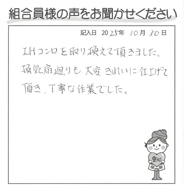 IHコンロを取り換えて頂きました。換気扇廻りも大変きれいに仕上げて頂き、丁寧な作業でした。