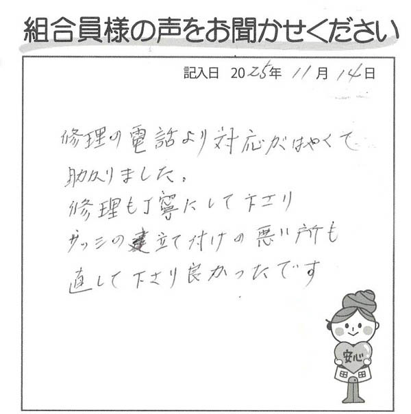 修理も丁寧にして下さり、サッシの立て付けの悪い所も直して下さり、良かったです。