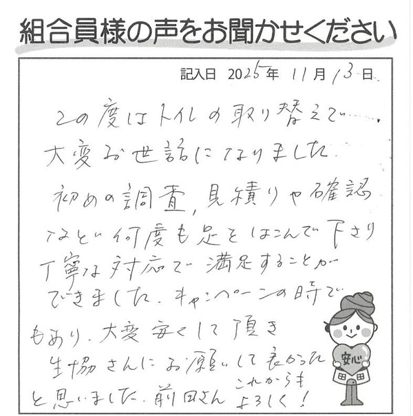 初めの調査、見積りや確認など何度も足をはこんで下さり、丁寧な対応で満足することができました。キャンペーンの時でもあり、大変安くして頂き、生協さんにお願いして良かったと思いました。前田さん、これからもよろしく!