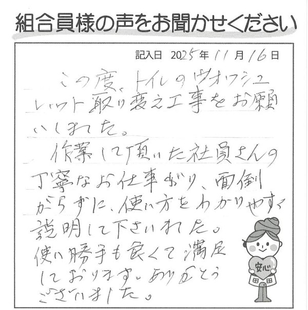 この度トイレのウォシュレット取り替え工事をお願いしました。