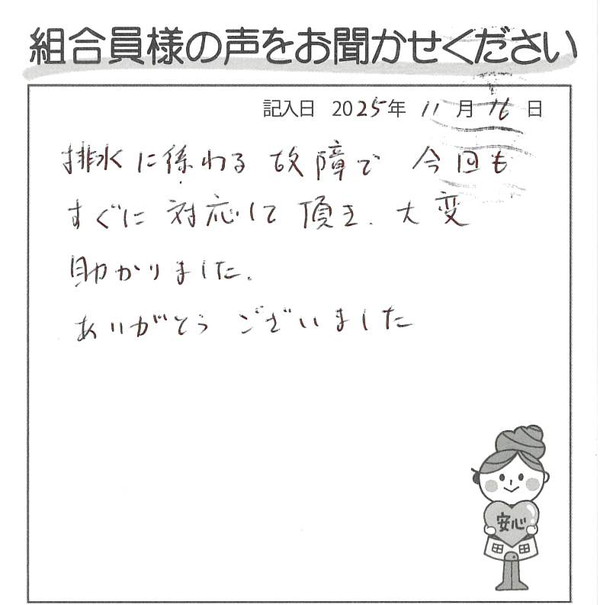 排水に係わる故障で、今回もすぐに対応して頂き、大変助かりました。