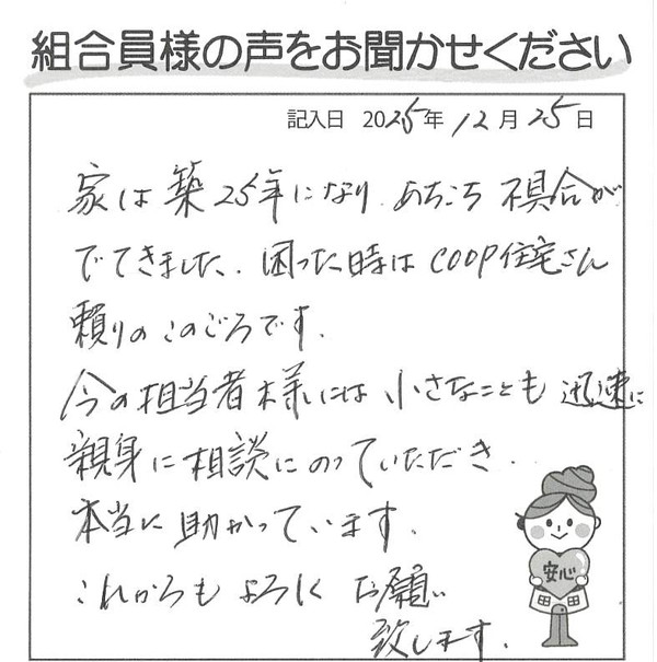家は築25年になり、あちこち不具合がでてきました。困った時はCOOP住宅さん頼りのこのごろです。