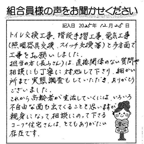 トイレ交換工事、階段手摺工事、電気工事(照明器交換、スイッチ交換等)と多方面で工事を御願いしました。