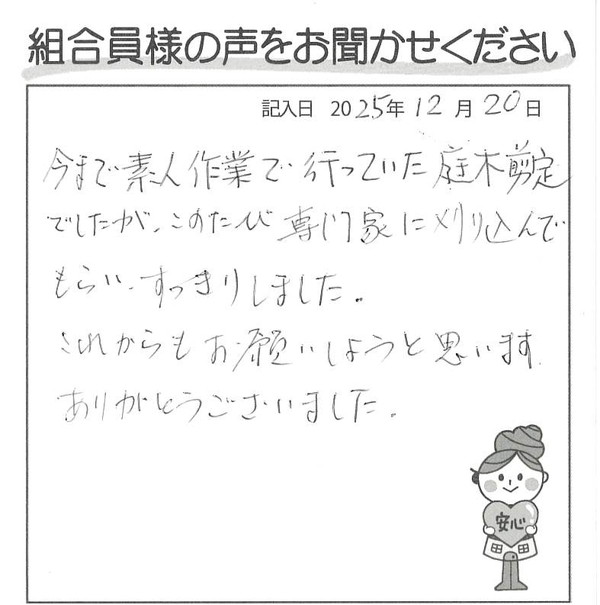 今まで素人作業で行っていた庭木剪定でしたが、このたび専門家に刈り込んでもらい、すっきりしました。