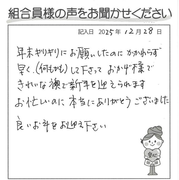年末ギリギリにお願いしたのにかかわらず、早く(何もかも)して下さって、おかげ様できれいな襖で新年を迎えられます。 お忙しいのに本当にありがとうございました。 良いお年をお迎えください。