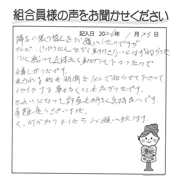 障子の張り替えをお願いしたのですが、テレビ・じゅうたんを少し動かさないとはずれなかったのに黙って気持ち良く動かして下さったので嬉しかったです。
