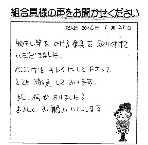 物干し竿をかける金具を取り付けていただきました。 仕上げもキレイにして下さって、とても満足しております。 また何かありましたら、よろしくお願い致します。