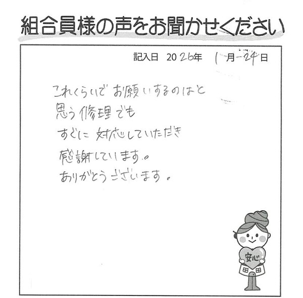 これくらいでお願いするのはと思う修理でもすぐに対応していただき、感謝しています。
