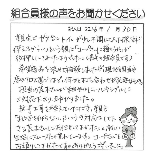 無事工事を終えていただき、親も「お上手を仰らない、ふつうの対応をして下さる荒木さんにお任せしてよかった」と、新しい生活にスムーズに慣れています。コープさんをお頼りしてよかったです。ありがとうございました。