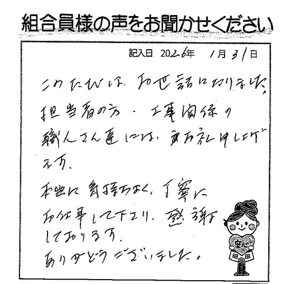 このたびはお世話になりました。担当者の方・工事関係の職人さん達にはお礼申し上げます。