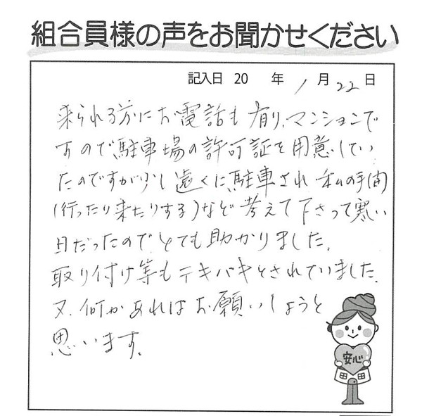 来られる前にお電話も有り、マンションですので、駐車場の許可証を用意していたのですが、少し遠くに駐車され、私の手間(行ったり来たりする)など考えて下さって、寒い日だったのでとても助かりました。取り付け等もテキパキとされていました。 又、何かあればお願いしようと思います。