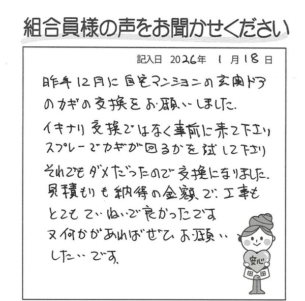 昨年12月に自宅マンションの玄関ドアのカギの交換をお願いしました。 いきなり交換ではなく、事前に来て下さり、スプレーでカギが回るかを試して下さり、それでもダメだったので交換になりました。見積もりも納得の金額で、工事もとてもていねいで良かったです。又、何かあればぜひお願いしたいです。