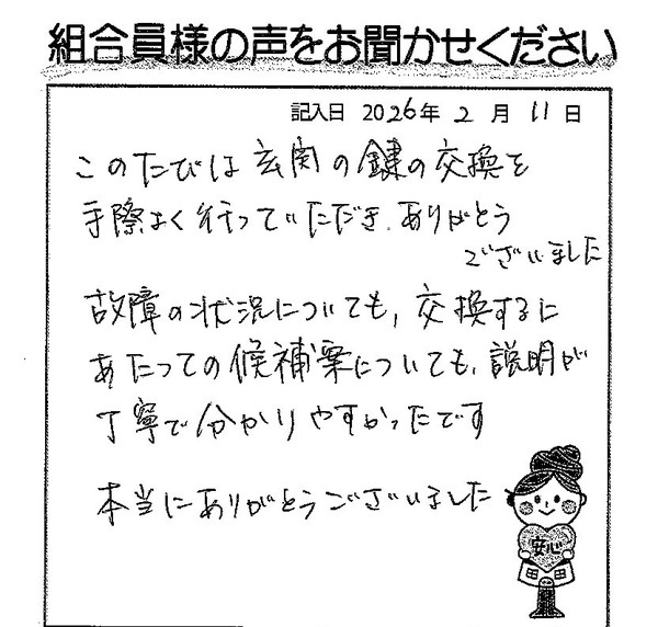 このたびは玄関の鍵の交換を手際よく行っていただき、ありがとうございます。 故障の状況についても交換するにあたっての候補案についても、説明が丁寧で分かりやすかったです。 本当にありがとうございました。