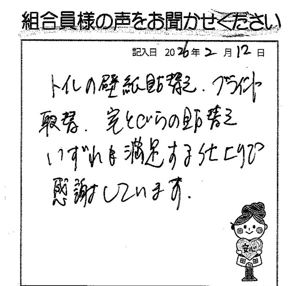 トイレの壁紙貼替え、ブラインドの取替え、室内とびらの貼り替え、いずれも満足する仕上りで感謝しています。