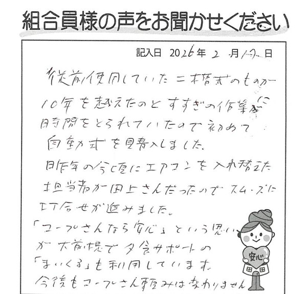 従前使用していた二槽式のものが10年を越えたのとすすぎの作業に時間をとられていたので、初めて自動式を購入しました。 昨年の今頃にエアコンを入れ替えた担当者が田上さんだったのでスムーズに打合せが進みました。「コープさんなら安心」という思いが大前提で、夕食サポートの「まいくる」も利用しています。今後もコープさん頼みは変わりません。