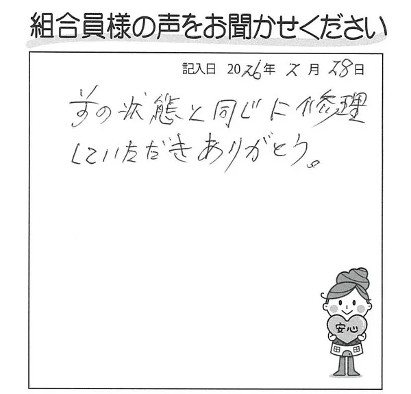 前の状態と同じに修理していただき、ありがとう。