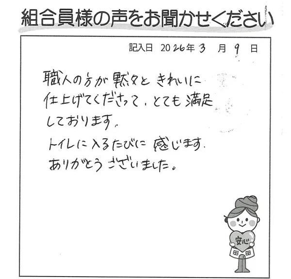 職人の方が黙々ときれいに仕上げてくださって、とても満足しております。 トイレに入るたびに感じます。 ありがとうございました。