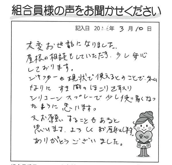 大変お世話になりました。 屋根の相談もしていただき、少し安心しております。 シャッターも現状で使えるとのことで、私なりにすき間のほこりを取り、シリコーンスプレーで少し使い易くなったように思います。 又お願いすることもあると思います。よろしくお願いいたします。ありがとうございました。