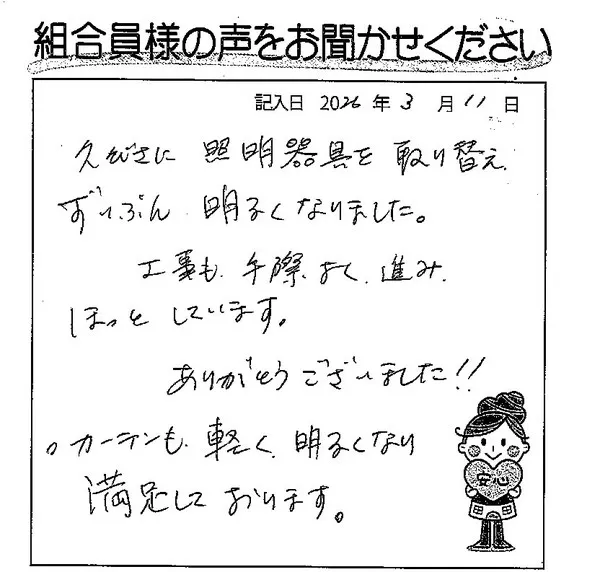 久々に照明器具を取り替え、すいぶん明るくなりました。工事も手際よく進み、ほっとしています。ありがとうございました! カーテンも軽く、明るくなり、満足しています。