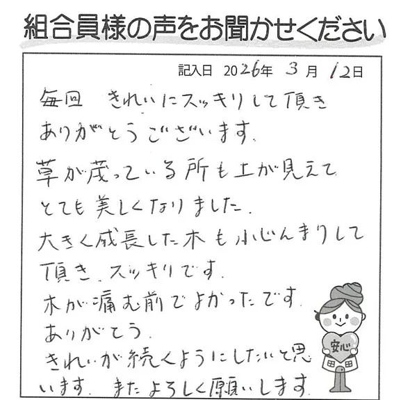 毎回きれいにスッキリして頂き、ありがとうございます。 草が茂っている所も土が見えてとても美しくなりました。 大きく成長した木もこじんまりして頂き、スッキリです。木が傷む前でよかったです。ありがとう。 きれいが続くようにしたいと思います。またよろしくお願いします。