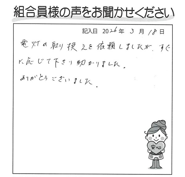 電灯の取り換えを依頼しましたが、すぐに応じて下さり、助かりました。ありがとうございました。