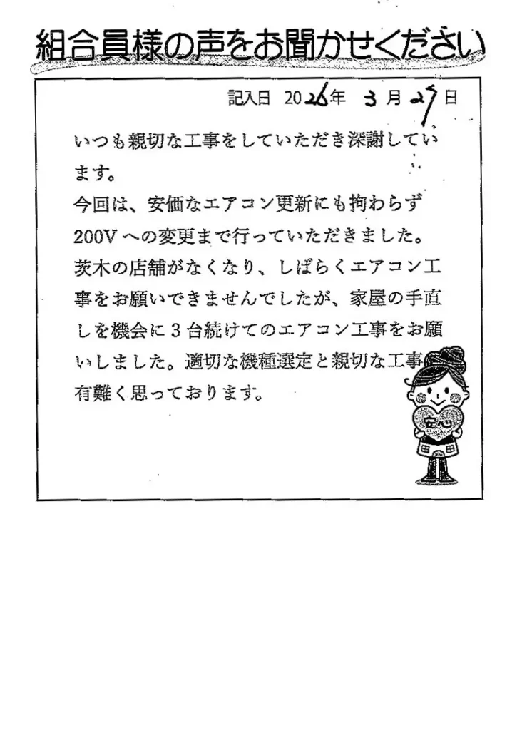 いつも親切な工事をしていただき、深謝しています。 今回は、安価なエアコン更新にも拘わらず、200Vへの変更まで行っていただきました。茨木の店舗がなくなり、しばらくエアコン工事を御願いできませんでしたが、家屋の手直しを機会に3台続けてのエアコン工事を御願いしました。適切な機種選定と親切な工事、有難く思っております。