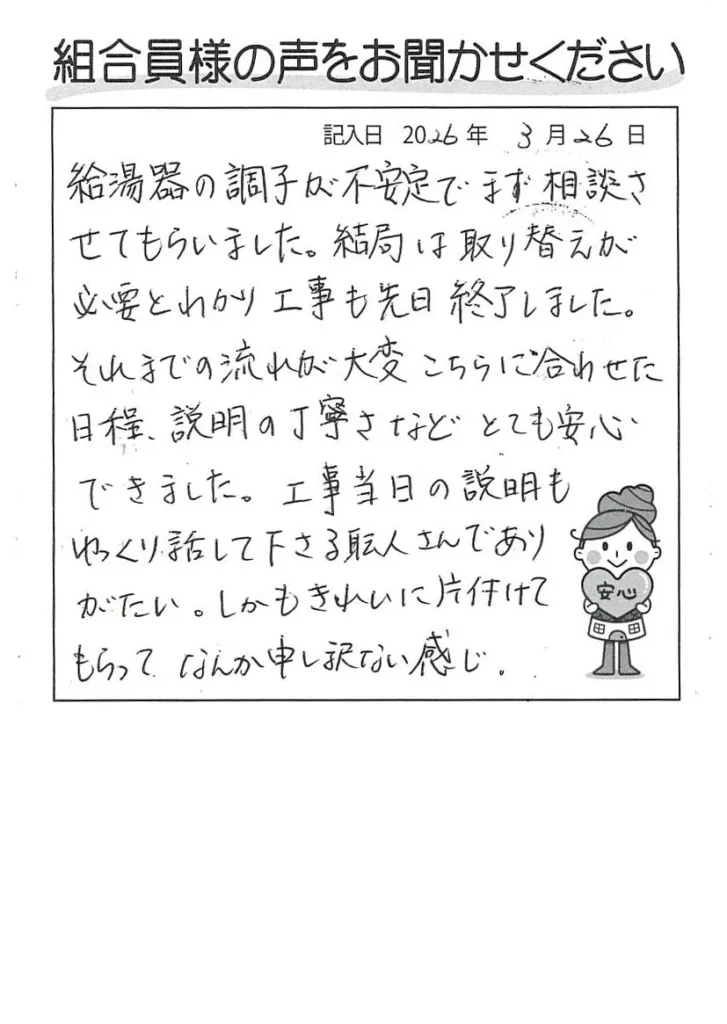 給湯器の調子が不安定でまず相談させてもらいました。結局は取り替えが必要とわかり、工事も先日終了しました。 それまでの流れが大変、こちらに合わせた日程、説明の丁寧さなどとても安心できました。工事当日の説明もゆっくり話して下さる職人さんでありがたい。しかもきれいに片付けてもらって、なんか申し訳ない感じ。