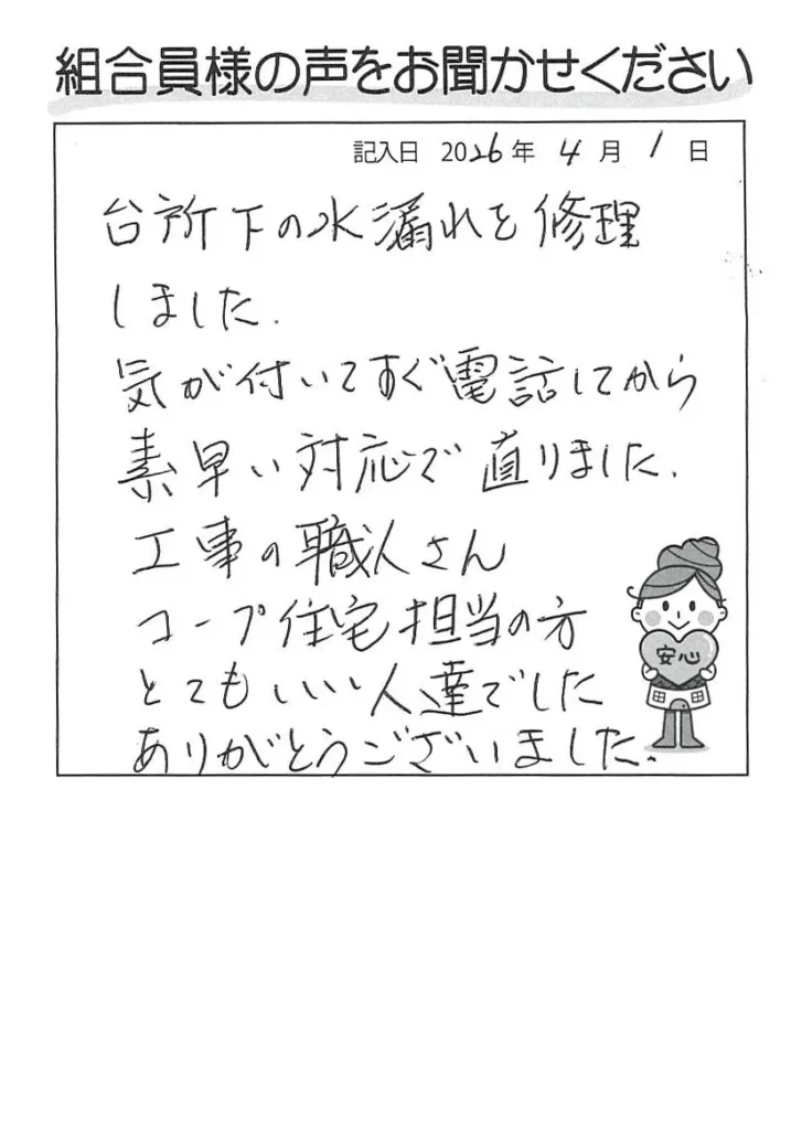 台所下の水漏れを修理しました。 気が付いてすぐ電話してから素早い対応で、直りました。 工事の職人さん、コープ住宅担当の方、とてもいい人達でした。ありがとうございました。