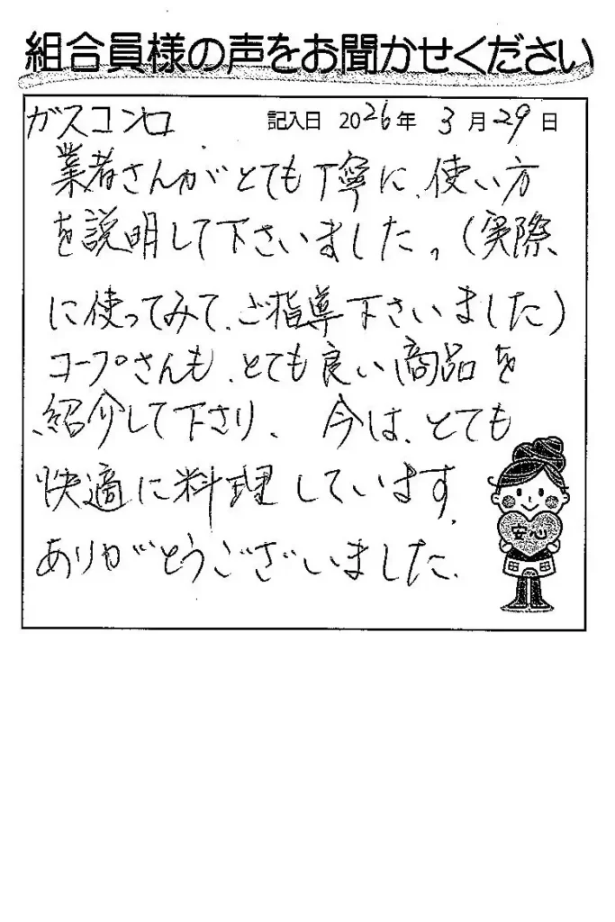 工事店さんがとても丁寧に使い方を説明して下さいました。(実際に使ってみて、ご指導下さいました) コープさんもとても良い商品を紹介して下さり、今はとても快適に料理しています。 ありがとうございました。