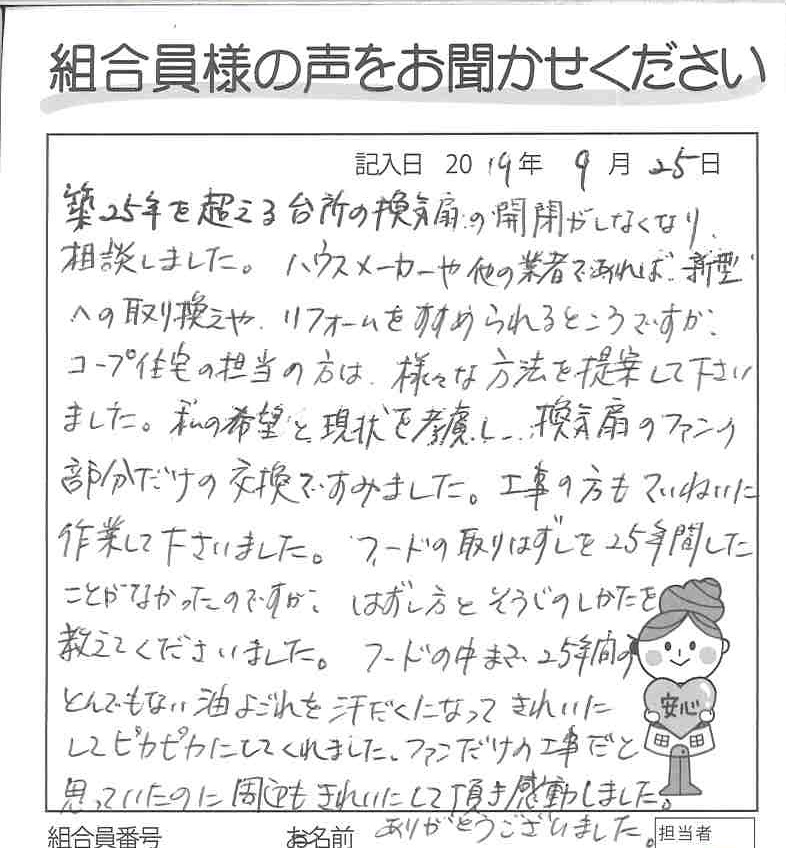 築25年を超える台所の換気扇の開閉がしなくなり、相談しました。ハウスメーカーや他の業者であれば新型への取り換えや、リフォームをすすめられるところですが、コープ住宅の担当の方は、様々な方法を提案して下さりました。私の希望と現状を考慮し、換気扇のファンの部分だけの交換ですみました。工事の方もていねいに作業して下さいました。フードの取りはずしを25年間したことがなかったのですが、はずし方とそうじのしかたを教えてくださいました。フードの中まで25年間のとんでもない油よごれを汗だくになってきれいにしてピカピカにしてくれました。ファンだけの工事だと思っていたのに周辺もきれいにして頂き感動しました。ありがとうございました。